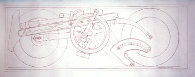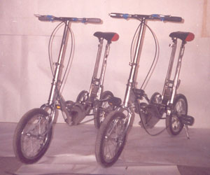 本实用新型涉及一种自行车,尤其涉及 一种便携式折叠自行车,包括车架及与 之连接的前轮总成和后轮总成,脚蹬轴,曲柄机构,其特征是:车架的前梁分 成前梁长管和前梁短管,前梁短管与车架五通固接,前梁长管上端与前轮总成 连接,下端与可使前轮总成向后水平方向折叠的前折叠连接支架销接,浮动车 架后斜梁与可使其向后轮水平折叠的后折叠连接支架销接,可分别向车架内侧 折叠的脚蹬曲柄与曲柄盒销接。本实用新型的有益效果是与前折叠连接支架销 接的前轮总成可向后水平折叠:与后折叠连接支架销接的车架后斜梁可向后轮 水平折叠,脚蹬曲柄可分别向车架内侧折叠,从而实现折叠后的自行车体积很 小达到方便携带的要求如:14寸,折叠后所占的体积长×高×宽980×350× 150mm、13寸965×325×150mm、12.5寸985×313×150mm这三种车型折叠后总高 度在本型号的轱辘直径之内,宽度没超过150mm携带方便成年人和儿童都适用。 经过多少次试验和改进,最后用手工做了两辆14寸样车,有照片。骑起来效果 很好。不用任何工具在十秒内把车折叠好。又经过北京阳光国际投资顾问中心 对本车和可行性研究评定最后说本方案可行五个大字,如果有人有意并想看便 携式折叠自行车可行性研究报告,请来电话联系。
