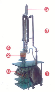 作用:在生物脱水过程中回收有机物; 高效萃取天然(鲜、干)植物中的挥发 油等成份。特点:融合了水蒸汽蒸馏与溶剂抽提两个化工单元,油-水分离器的 设计实现了连续操作。与传统蒸馏法相比,提取挥发油产量高2-5倍,有效成份 更多;与超临界法相比,成本更低,操作更简便。应用范围:应用本发明核心 技术分别制成两套设备:生物连续提取器(见图1),是供生物(鲜、干)提取 有效成份,用于中药、保健品、化妆品、杀菌杀虫剂等研发生产使用的中试设 备(可按需扩大)。用于改造蒸馏法提取挥发油,产量成倍增加。原生态样品 制备仪(见图2), 是供实验室大型分析仪器的制样用,可避免化学成份漏 检。 (下面是两张图片)设备的各组成部分:(1)水和物料汽化器(2)有 机相汽化器(3)萃取塔(4)油水分离器(5)捕集器(6)电控器构件。设备 的运作流程:物料+水置入(1)升温汽化,选定不溶于水的有机相置入(2)升 温汽化,两股气相进入(3)在塔内完成气态到液太的过程,同时实现气-气及 液-液的分配过程,液体流入(4)因其混合液的比重之差而分层,有机相在上 层;随着液体不断流入,分层之后的两相各自回流到汽化器,实现操作的连续 化。产品从蒸出的有机相得到,有机相可重复利用。设备使用案例:鲜中药X: 药典法得量1,质检含有组分20,连续萃取法得量10,质检含有组分115;鲜中 药Y:药典法得量1,质检含有组分47,连续萃取法得量4,质检含有组分65;