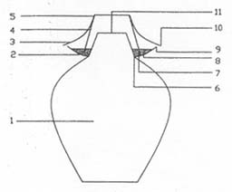 一种能保持咸菜卫生安全的卫生咸菜 罐。它是在咸菜罐的盖帽的顶部沾附一层 与盖帽的中下部由小到大有一定的间隙,并约大于盛水钵边缘的卫生帽。卫生 帽的顶部和盖帽的顶部同口径沾合为一体。当盖上卫生咸菜罐的盖帽及卫生 帽,既可避免空气中的尘埃和房内一些杂物进入盛水钵,又能保持罐口自然呼 吸和盛水钵内的水通风透气,从而达到钵内的水不变质和罐体内的咸菜卫生安 全的目的。卫生咸菜罐是一种新型咸菜罐。该项发明解决了现有的也是若干年 以来的咸菜罐盛水钵中的水易变质,以致变质的水随着咸菜罐呼吸部分水分而 进入咸菜罐体内,导致人们吃了不卫生的咸菜的问题。吃咸菜是历史以来多数 人的生活习惯。因此,咸菜罐在多数家庭、宾馆中都具备。而新型的卫生咸菜 罐的发明和使用,不仅外观新颖,便于除尘,而且能让人们吃上安全放心的咸 菜。这实属换代产品,倍受家庭和宾馆喜爱。有广阔的市场前景,完全可以投 入生产。