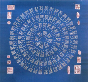书法《中华百龙图系列》系中国著名 书画家陈晓钊先生从1990年开始,经过十五年潜心研究,将书法与绘画融于一 体,创造发明书写完成。2004年7月获国家版权;2005年11月获国家知识产权局 外观设计专利十四项。该书法由(楷、行、草、篆、隶、魏、甲骨文)等七种 书体组成,每种书体一百个“龙”字共计七百余字;每一百个“龙”字均采用 圆形和竖形书写而成,其造型独特,立意新颖及整体的中华民族特色之美,为 2008年北京奥运会增添了新的光彩。书法《中华百龙图系列大全》的发明,是 继我国早期明清前人发明的“百福、百禄、百寿、百喜”等吉祥图案之后,又 一大型“百龙吉祥图案”;《中华百龙图系列大全》的问世将广泛应用于绘 画、建筑、环境艺术、园林、家具、文具、文教、文房四宝、民间工艺品、手 工艺品、竹木工艺品、石蜡工艺品、雕塑、雕刻、陶瓷、陶艺、茶具、玻璃、 水晶、锡铅、搪瓷、不锈钢、金属、塑料、首饰、玉石、纺织、服装、衣料、 丝绸、染织、刺绣、地毯、壁挂、剪纸、印刷、包装、标贴、戏曲、影视、广 告、装潢、旅游、纪念礼品、工艺美术用品及装饰等四十多个行业领域均有可 持续实用开发价值。注:请参阅2005年国家知识产权局专利公报第21卷 45、48号