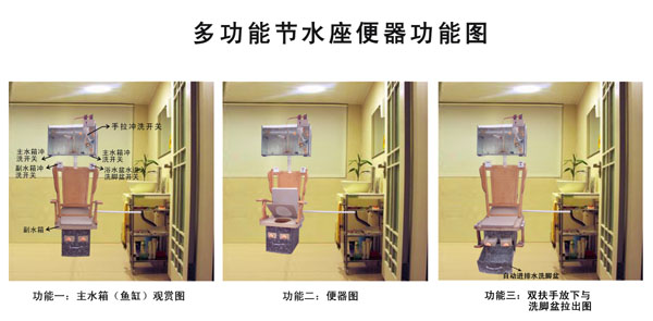 本坐便器特别适宜年老体弱群体使用的 多功能节水坐使器,它集观赏鱼缸作主 水箱,水量可任意控制:便器上方设有靠背,扶手(可任意同时或单独使用及放 下)特别适宜年老体弱人员作支点,起到安全保护作用:便器上方装有付水箱, 也可将洗脸盆的生活用水存入此水箱作冲洗便器用,也可放进下方自动进,排 水的洗脚盆内作洗肢用,它既美观环境又节约水资源。