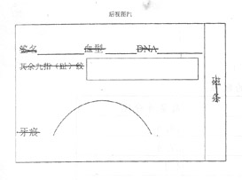 一、设计要点:现有*上识别 身份最主要的项目只有面部肖像与* 编号,可是面孔可通过化装、手术改变,编号也可能会出现重复或泄露。因 此,新增加设计了指(趾)纹、亲笔签名、血型、牙齿痕迹、DNA、磁条六项帮 助识别身份的项目。(1)指(趾)纹:人的指(趾)纹无法改变、很少与他人 重复,具获取、辩别较方便。(2)亲笔签名:使用较广泛,一般较难假冒,它 可以作对照笔迹、鉴别真伪时的参考项目。(3)血型:有鉴别身份的参考作 用。也可在伤员急需输血时直接根据卡上记录输血,这样更能节省时间,避免 化验误差。(4)牙齿痕迹:可以用来鉴别身份。尤其是鉴定对象不能使用以上 三种方法确定身份时(如尺体被烧焦等)。(5)DNA:是目前最先进的、最能 全面确定身份的鉴定方法。在以上四种方法都不能完全确定其身份时(比如: 犯罪现场只有毛发、血渍、唾液等),就可以通过化验结果对照*上的DNA 来确定其身份(新证户籍档案系统应记录)。(6)磁条:内存一些一般不宜公 开却对公安工作有用的信息资料,如犯罪前科记录等。二、附图说明:(1)主 视图:是*卡片的正面。在右下方是其右手食指纹或右足拇趾纹(失去双 手者就用趾纹)。(2)后视图:即*的背面,右侧边是磁条,上排分别是 其亲笔签名、血型、DNA,第二排是其他九个手指纹或趾纹(其余九只为备 用),最下面一弧形是其牙痕照片。此设计利于打击和预防犯罪,使公安工作 效率提高,人民群众更加安全。