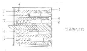本实用新型结构简单,整个锁芯由壳 体、活动锁芯、固定锁芯及销棒组成,当钥 匙插入后,两节销棒接点处在固定锁芯与活动锁芯的同一平面时,即可开启, 该种锁芯如做成多孔结构(孔内穿入销棒),其钥匙的变化将达上亿处之多, 防盗性强,即便了解其结构,没有相同的钥匙根本无法打开。
