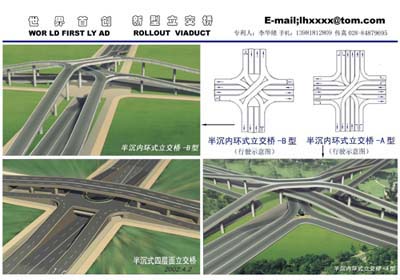 人们为了避免地道和降低桥地面以上立 交桥的高度和层数,于是蝶式立交桥应 运而生。在城市寸金寸土的情况下修建这种占地面积大的桥不太现实。并且从 地面算起它的高度也是在两个5米的净高以上,为了变道和借道它的左转弯角度 就成了180度。也就是说转弯直径就必须控制在最小范围内才能不增大占地面 积,但就这样它的占地面积也就很大了。 另它的功能明显的受到很多限制,由于左转弯的借道和变道,直接影响了东西 方向和南北方向主道的车流量和安全。而且驾驶员对立交桥的走向无直观辩 向,经常走错道后无法在桥上调头。而且无专用的非机动车和人行道。 为了和传统的蝶式立交桥对比,以不占地的专利新型《四层面立交桥》为例 (见附件),这种立交桥从地面算起是2,5米和5米的两个净高,也就是说目前 世界上任何形式的立交桥都不可能再低于这个高度了(指从地面算起)。从车 流量来看东西方向和南北方向、四个右转弯都不受任何影响,四个左转弯我们 把它放在离地面2,5米净高的一个转盘上进行转向,也符合交通规则和安全。 通过大概计算一般十字路口的东西方向和南北方向主道的车流量比例占60%,右 转弯占20%,左转弯占20%,我们相信让20%的车流量在转盘上进行90度角的左转 弯没问题的。 这个离地面2,5米高的转盘担负了三大功能,一是给地面的行人和非机动车辆 提供了专用通道。二是通过转盘完成了左右转弯的功能。三是可以通过转盘进 行立交桥上汽车调头功能。从四层面立交桥整个外观来看高度不超过10米,一 般的十字路口都能修建这种不占地的立交桥和满足汽车最小转弯直径14—20米 的要求。根据我申请PCT国际专利的情况来看,目前世界上还没有不占地的立交 桥。而且立交桥的造价也很低。驾驶员不会走错道,既便错了也可在桥的转盘 上调头。在城市十字路口修建这种不占地的新型立交桥应该是很适合的。