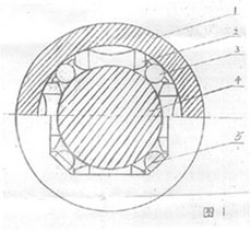 本实用新型提供一种直线运动轴承,用 于圆柱形轴上承载较大负荷、做直线运 动的机构。所采用的技术方案是:在轴承外圆内沟道内沿圆周方向间隔分布四 个滚珠和四个有内弧槽的圆柱滚子。滚子内弧槽的曲率半径与圆柱形轴相同, 两者做线接触。滚子外鼓曲率半径与轴承外圆内沟道半径相同,两者也做线接 触。用保持架将滚子和滚珠固定在轴承外圆上。当轴做直线运动时,滚子和滚 珠同时在轴承外圆内沟道内转动。因为是线接触,所以能承受较大负荷。本实 用新型不仅可提高做直线运动的轴的承载能力,而且结构简单,成本低廉。