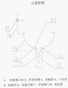 现在的坐便器均为各有水箱的虹吸水封 式原理的构造,“水封”其作用就是以 水封隔便池和排污管道,以防管道异味逸散。“水封”就是在便池通道内构造 了一个拐弯,它的致命缺点就是浪费水,因为这只能在具有一定数量和一定压 力冲劲的水形成虹吸后才会携带着便污通过它。本坐便器的优点是①没有水 箱。②完全去掉了拐弯“水封”,排污管道是无弯曲顺畅的直通管道。③在便 池与排污管道衔接处安装了个“封隔管”(与肛门相似),起着和拐弯“水 封”一样的作用。④便池的后半部分的内壁斜度很大(即很陡),以减少大便 坠落的阻力。⑤为了减轻便池的沾污,在便池的内壁喷涂一些自洁材料,如疏 水疏油的纳米材料。该坐便器关键部件是“封隔管”,它是用很柔软的橡胶或 塑料制成的,它口端硬实的凸缘镶嵌在便池底部的凹槽内,没外力时它呈闭合 状态,有了便污闭合力承受不了便污的重力,于是“封隔管”就自行张开将便 污地入管道,无外力作用又恢复闭合状态(弹力或磁力的作用)。与小便相比 大便排污是最费水的,可是上述便池经过前面的根本改造,大便可以自行顺畅 地坠落于排污管道,完全用不着像老式便池用水冲的过程,只需要用刷子和喷 头(与自来水用软管直接连接并各有手柄和开关)来清洁一下轻微的沾污即 可,大便一次用水不超过一升。