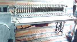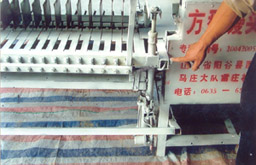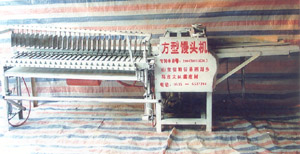 方形馒头机,用于制作方形馒头。 它主要由机架、轧面机、和成型轧轮、 叠面器、切面器组成;轧面机和成型轧轮主要由固定在上下轧辊轴上的尺寸, 依次减小的四对轧辊组成;叠面器由装有合页的三片纵向条板,传力杠杆、拉 绳、滑轮、踏板、轴组成。切面器由切面助力器、U型摇杆、摇杆轴、刀架、一 组切刀、支架及览杠、回位弹簧组成;手动反板器由翻板器手柄、同步摇板及 可翻转的翻板组成;在翻板的同一侧设有缺口,在机架的下部对应于翻板的缺 口设有盛料盘。本实用新型完全模仿手工方式,生产方形馒头,馒头口味与手 工制作的方形馒头的口味完全相同,出产效率高,劳动强度小,给现代的人工 制作对比的优式是:手工捋条和人工切馒头的方式,采取机械和电动方式,适 于馒头批量出产单位。