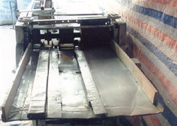 方形馒头机,用于制作方形馒头。 它主要由机架、轧面机、和成型轧轮、 叠面器、切面器组成;轧面机和成型轧轮主要由固定在上下轧辊轴上的尺寸, 依次减小的四对轧辊组成;叠面器由装有合页的三片纵向条板,传力杠杆、拉 绳、滑轮、踏板、轴组成。切面器由切面助力器、U型摇杆、摇杆轴、刀架、一 组切刀、支架及览杠、回位弹簧组成;手动反板器由翻板器手柄、同步摇板及 可翻转的翻板组成;在翻板的同一侧设有缺口,在机架的下部对应于翻板的缺 口设有盛料盘。本实用新型完全模仿手工方式,生产方形馒头,馒头口味与手 工制作的方形馒头的口味完全相同,出产效率高,劳动强度小,给现代的人工 制作对比的优式是:手工捋条和人工切馒头的方式,采取机械和电动方式,适 于馒头批量出产单位。