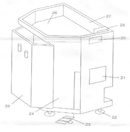 本实用新型涉及一种自动化数码智 能微电控家用污水处理再用箱,是设计 一个能够安装在洗面盆下方,外观与洗面盆成为上下一体的箱体结构,目的在 于提供一种设备结构简单能实现家庭生活所有的用水,如:洗菜、洗衣、洗澡 等可同时注入管道中,经漂浮筛滤,污水清洁度感应识别分类、沉淀、过滤、 清水二次过滤杀菌等污水处理,再二次自动化循环抽入便盆用水或便池用水, 以及冲洗地面与涮拖布等用水,提高水资源利用率,节约用水,减轻家庭用水 的经济负担。箱体内构成安装主要有:污水输送盒、各种过滤器、污水清洁度 感应识别器、两个储备桶和漂浮筛滤器及各种过滤器内部自备自动化清洁去垢 装置,智能型电控和自然控式自动化切换自来水补充便盆用水装置,人工脚踏 冲气给清水储备桶内施加气压,使清水自流式供给便盆用水装置,各器件和各 电器件自动诊断故障感应数码智能式传感提示语音器,智能型微电控防湿全封 闭式密封配电盒,智能型光声动感应和水控用电源控制装置等。配套有:便盆 水箱内智能型控化进水和堵塞进水口防止箱内水倒流控制器。本箱全部采用耐 酸碱,耐腐蚀的PVC等为原料,制做成各种管件、箱体、器械等,箱体塑料是双 层的,永不生锈,体轻易装,污水经处理能够达到清洁无味、无杂质、无污 垢,杀菌率达到99.9%(不能饮用),本箱总储水量60升,可安装于宾馆、旅 社、饭店、商店、机关、学校等洗手间里,是有污水的地方都可使用。