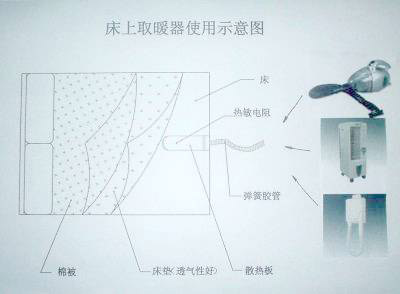 在寒冷的冬天,尤其是在没有暖气装置 的我国长江以南地区,作为床上取暖器 具,我们最为熟悉的是电热毯,但电热毯不安全易漏电,且不能清洗等缺点, 而其他的一些床上取暖器要么就是结构复杂,要么是不实用。针对此,本实用 新型专利,它克服了现有取暖装置的不足,提供一种结构简单、价格底、小巧 方便、节能环保、安全可靠,而且不会影响现有床体款式结构的最简单,最直 接的床上取暖器。本实用新型取暖器的工作原来是:利用风机、发热丝产生热 风,通过弹簧胶管与散热板连接,散热板为一扁长方薄片,内有栅状通风槽,该 散热板是安放在透气性好的床垫下,利用床垫与棉被形成的空间进行储热取 暖。在安全方面,在散热板上设有热敏电阻,在电热丝腔内设有双金属片温控 器、热熔断器等能达到安全、恒温的作用。而且,利用本实用新型专利可以演 生出多个产品,如:1)与小型吸尘器(外型)结合可生产出时尚的取暖器; 2)与现有空调扇结合可生产出一年四季能用的“风扇”,当不用取暖时可将弹 簧胶管及散热板收藏在扇内;3)与干肤器结合可生产出集取暖、干肤、干发等 功能。本专利实为各小家电生产厂家及有志于取暖器材生产投资者的理想项 目!