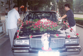 裹,彩带连成十几米长,把婚车从头至尾连成一圈,把鲜花捆扎在彩带上后折叠