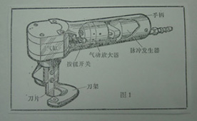 在金属板材加工中,经常需要将金属板 材按照一定的几何图形剪切下料,常见的 剪切机械是剪板机。它只能将金属板材剪切成方形、三角形或多边形等几何形 状,如果要剪切成园形、弧形,甚至复杂的几何形状,就要用电动剪刀或气动剪 刀等来进行剪切加工。电动剪刀和气动剪刀都采用旋转的动力头,通过机械机 构,将旋转运动变换成直线运动,然后带动刀片,进行剪切,这些剪切机械存在 着结构复杂、机械能转换效率低、体积大、重量重等缺点。所以不能获得广泛的 应用。本发明专利采用射流技术制成手提式剪刀(简称射流剪刀)。以压缩空气 为动力源,外形象一把普通电钻,重量只有一公斤。具有结构简单、制造容易、 重量轻、体积小、操作灵活等优点,可以剪切各种金属薄板(2mm以下),最小 剪切半径为15mm,剪切振动频率可在0-800次/分范围内任意调节。这种射流剪刀 还可改制成射流鎯头、射流锯、射流提花机等。射流鎯头可以用来校正和成形钣 金件,射流锯可以锯割射流剪刀难于剪切的厚板,射流提花机可以手工修补、织 造地毯之类的工艺品。