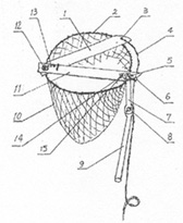 本实用新型要解决其技术问题所采取的 技术方案是:高型果树采果器由摘果刀、 网兜、手柄、拉索组成,摘果刀的固定刀片紧固在网兜上面,并与手柄的连杆和 网兜的圆环固定在一起。拉索一头固定在摘果刀的活动刀片上,另一头由采果者 控制。所述摘果刀由固定刀锤和活动刀片构成,张开由弹簧支撑。所述网兜的上 口有圆环,所述手柄由可调整角度的连杆和握在采果者手上的长柄组成,连杆的 一端与圆环和固定刀片紧固,另一端与长柄通过蝶形螺栓固定,必要与可调整采 果器的角度。本实用新型结构简单、使用方便,操作人员只要站在地面,就能持 长柄将高处枝条上的果实摘取而不损伤果实和果树,这对摘果者来说,既安全又 方便。附图说明:图1是本实用新型结构示意图。图2是本实用新型零件分解示意 图。各部名称及序号:1.活动刀片、2.圆环、3.拉索固定孔、4.拉索、5. 紧固螺丝、6.拉索套环、7.连杆、8.蝶形调整螺丝、9.手柄、10.网袋、 11.固定刀片、12.中心活动销、13.张力弹簧、14.连接片、15.螺丝孔。