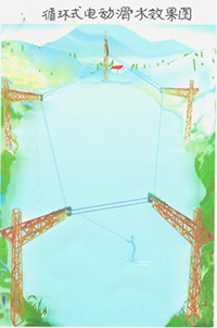 随着现代人物质生活水平的不断提 高,对娱乐与体育健身方面的要求也相应 地不断提高。一些传统的娱乐健身项目已逐渐不能满足其需求。于是,新兴的 “循环式电动滑沙滑水”项目便随着时代的潮流应运而生。滑水是一项高尚的体 育健身运动,在西方及发达国家非常流行。它既是一种竞技运动,又极具观赏性 和娱乐性,可作为一项趣味独特、感受新奇的娱乐健身项目。然而,滑水也是一 项高消费运动,必须配置价格昂贵的大马力快艇,同时还要消耗大量的优质汽 油。因此,比较贫穷落后的国家,滑水运动难以普及,当然,更谈不上将其作为 大众化的娱乐健身运动。“循环式电动滑沙滑水”装置的诞生,大大降低了滑水 训练的成本,它不需要快艇,也不需要汽油,仅采用电能为动力,符合环保要 求。对空气,水质均无污染,且无噪音,有效地保护了生态环境,为滑水运动的 普及和将其作为一项大众化的娱乐健身运动开拓了极为有利的局面。应用于滑 水——滑水者脚穿滑水撬,双手握住拉把,拉把上的拖绳与循环运行的牵引绳连 接,身体控制好平衡,由循环运行的牵引绳拖着在水面上滑行,时速最高控制在 50公里以内。滑水者在碧波之上高速滑行,纵横驰骋,既惊险刺激,又潇洒惬 意,既享受了高尚的娱乐,又锻炼了意志和身体。特别是在炎热的夏季,滑水更 是一项无可替代的最佳娱乐消遣活动。应用于滑沙——在不具备合适水面的地 方,又可将该装置应用于滑沙,使人仿佛置身于莽莽大沙漠之中,体验那种具有 沙漠风情,别具一格的趣味与刺激。滑沙者脚上配置滑沙撬,手握拉把,身配一 支电子激光枪,在沙海之中穿行,时而可见到有各种野生动物靶子的出现,若能 抓住时机准确地射击,便能击中猎物。也可单独或与人共乘一辆特制的滑沙车, 轻松自在地在沙漠中滑行,射击猎物。最后按所击中的猎物种类、数量、获得相 应的奖品。其感受真可谓是不可思议,同时,也达到了很好的健身效果。该项目 男女老幼皆宜,且不受季节限制。