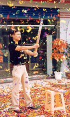 背景:传统的火药烟花爆竹在生 产、燃放(使用)中,存在诸多隐患(危险), 也受国家诸多限制。而历史习俗、节日活动迫切需求类似用品。该专利避害趋利 地迎合时代与大众所需,填补了巨大的市场空缺。特点:本专利以压缩气体为发 射动力(不用火药、无毒害),轻轻拧动开关,嘭的一声,色彩缤纷的彩花彩带、 彩伞和吉祥字幅……喷薄而上(射高2—30米,高度可调),似天女散花般绚丽多 姿、璀灿夺目,伴着芳香气味,把天空大地装扮成如花潮簇涌,强烈烘托节日气 氛,将活动推上文明、精彩、热烈的高潮。用途:1.在室内、室外、白天、夜 晚均可释放,突破了鞭炮只能在室外燃放,烟花需要夜间释放的局限。 2. 适应婚寿喜庆民俗佳节,商业、公益活动,文艺、体育盛会。注:己制作样品, 可实际应用,效果圆满。