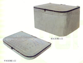本实用新型涉及建筑工程用采暖入口。 该采暖入口包括入口井壁和井盖。入口井 壁与井盖连接处有一加强梁,在井盖和加强梁之间装有合页。与加强梁相对的另 一边井盖与入口井壁连接处装有锁箅。该采暖入口采用钢纤维混凝土制成,具有 整体性好、强度高、表面光洁、美观大方的特点,上锁后便于管理,不易被损 坏,并方便开启。