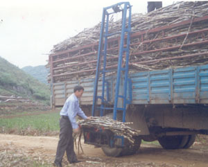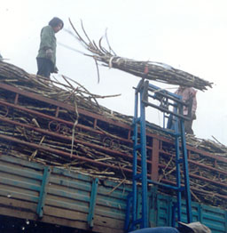 上砍好成捆的甘蔗输送到运蔗车上的悬挂式甘蔗装车机。使用时,两个人把装车