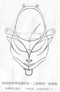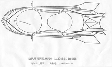 防风防雨两轮摩托车(简称“二轮摩托轿 车”、“轿车化摩托”、“二轮轿车” 或“两轮轿车”等),其特征是:由顶盖、车门、挡风玻璃、前唇盖及尾箱与两 轮摩托车底架结合而形成驾驶舱、乘客舱和行李舱在内的全封闭保护壳体。一共 可以乘坐3个人(两个大人和一个小孩)。踏板两侧留有脚踏地活动空隙,且有开 合自如的活动防尘盖板,以便驾驶员在停车时很自然地伸脚撑地,同骑二轮摩托 一样把稳轿车,绝无妨碍。加之车门下部还可以向外自由活动,更加确保驾驶员 伸脚踏地的安全。该车只有一前一后两个轮子,此外不设任何防侧倒的辅助轮之 类。制动方式实行多重保险制动结构,以保证在各种情况下的人车安全。壳体上 设有保险杠、活动玻璃门窗、雨刮器、各种通风散热孔、开合自如的通风顶盖、 各种灯、翼翅状凸起性空气导流器等,整车形状略呈飞机或火箭的造型,科学地 体现出了空气动力学的特点。该发明综合了二轮摩托与四轮轿车的优点,美观豪 华、经济实用、小巧灵活、防风防雨、安全可靠,故适合广大人民作为风雨无阻 的代步工具。并且结构简单,易于制造。生产者生产此车时,成本不高;购车者 购买此车后,花费不大;仅仅是“摩托车的费用”,但却是“小轿车的享受”!