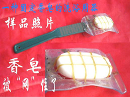 “一种固定香皂的洗浴用器”,其结构 十分简单,它采用固定香皂的网或橡皮筋 通过橡皮筋、或弹簧连接在框架或防滑板上。它能很好地将香皂固定在手拿的器 具上,使用时不会滑落,网还能对肌肤有一定的搓洗和按摩作用,且手杆有一定 的长度,能将香皂洗擦到后背等任何部位。本专利技术的作用是:解决了人们用 香皂洗浴时遇到的两个问题:一是香皂容易从手中滑落以致滑入排水管(沟); 二是香皂擦拭不到后背,特别是老年人和肥胖者。另,它能完全用尽每一“滴” 香皂,避免浪费。它的特点是,主要为塑料(胶)制品,制造容易,一般的塑料 日用品生产商均有生产能力;成本低廉,一把一元左右;市场潜力巨大,使用香 皂的人都是它的顾客。