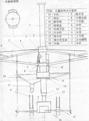 这是一种新型的伞,可手持使用,也可 戴在头上使用。它是由三折伞改造而成, 除保留原伞使用功能外,还可将伞杆收缩后由上部顶出伞外。用每组伞骨上加装 的“帽伞骨”所形成的“帽圈”将其固定于头部,作为头戴伞使用。其帽圈边缘 处穿有绳索,可调节帽径大小;并以帽带勒于下颌并锁紧,即可将伞牢戴于头 部。用后折叠好,与原伞完全一样大小。另外在下伞枢处设有圈绳器,可将帽带 收于储绳盒中。手持使用时,可将帽带收起而不显凌乱。头戴使用时只需一拉即 可将帽带拉出。该伞结构简单,只在原伞每组伞骨上加装一“帽伞骨”。上、下 伞枢、伞柄等塑料件的形状结构有所改变但均可一次性铸塑成型。帽伞骨是用直 径1mm钢丝弯成“U”型长140mm、宽8mm的条状,以绞接的形式装于每组伞骨上。