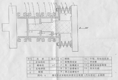 爆破片式车船防冲撞安全装置是涉及交 通运输领域中车船用的机械式防冲撞安全 装置。 本装置由爆破片、冲击棒和固定装置三部分组成。其中爆破片选用有 相当强度且具有脆性的材料制成圆环形圆饼形片状,冲击棒为不同直径多台阶的 圆柱形棒体,设有冲击头端面和多个冲击台阶,冲击棒用高强度金属材料调质处 理具有高强度和韧性。固定装置由带有套有压缩弹簧的螺栓柱的前端固定架和多 个中间固定架以及后端固定架串接组成。其中,冲击棒穿设在固定架中,爆破片 安装在冲击棒的各冲击台阶前,其外缘夹装在两固定架之间。使用时冲击棒后端 和前端固定架的外套有压缩弹簧的镙栓柱与汽车的前保险杠连接,后端固定架与 车身大梁连接。当汽车受到前方冲击力或汽车冲撞前方障碍物时,前方保险杠受 力,压缩弹簧压缩,螺栓柱向后运动,带动冲击棒向后运动并击碎第一级爆破 片,如外力还很大,将继续带动冲击棒逐级击碎后面的各级爆破片甚至破坏固定 架,在此过程中,每当冲击棒击碎一级爆破片,就吸收了部分冲击能量,这样使 冲击力逐级减缓,从而达到保护汽车本身和乘员安全的目的。本装置简单、可 靠,维护方便可安装于车身前端、后端及侧面。本装置具逐级减缓冲击力的特 点,可以最大限度保护车身安全和人员安全,较之目前使用的吸能式车身等安全 装置有更大优点。