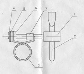 本人的专利,因为新设计了螺母(图 中7,螺母前表面的螺孔两边各有一大 孔,螺母后表面的螺孔两边各有一小孔。双圆形的一端,呈两个合拢鱼钩状分别 卡在螺孔两边的小孔前、大孔内);新设计了槽口垫片(图中6,槽口垫片中有直 槽口、斜槽口,是卡双圆形另一端的);新设计了开口销(4)、垫片(5);所以能 用不锈钢材料制作,能防锈。现有技术钢丝式水箱卡箍,如果用不锈钢钢丝制作 双圆形,在使用时,该卡箍就会散落。这是因为不锈钢钢丝的强度比钢丝的强度 差,所以钢丝式水箱卡箍不能用不锈钢材料制作,不能防锈。现有技术钢皮式卡 箍,如果用不锈钢材料制作,在使用该卡箍时,钢皮(卡胶管的那一部分)上的 螺纹就会刮丝,所以钢皮式卡箍不能用不锈钢材料制作。现有技术煤气胶管卡 箍,因为它的螺杆的直径小、螺孔小,用不锈钢材料根本加工不出来(螺杆上的 螺纹、螺孔上的螺纹加工不出来),所以煤气胶管卡箍也不能用不锈钢材料制 作。本人的专利与上述现有技术相比较有三个优点:①能防锈。②抱紧力大。③ 结构紧凑。所以能取代它们, 以及现在还没有将水管紧固在水龙头上的装置, 所以本人的专利用途非常广泛。