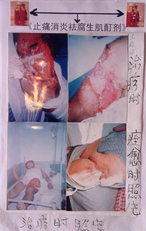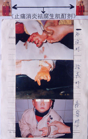 一、本药品为外用酊剂:橙色透明 液体, 笔者精心研究、探索、发明,经历20年临床实 践证明对外伤、烧烫伤取得了惊人的疗效,并 无副作用,是国内首创的一种人类外用药剂, 也是家庭生活必备的神奇特效良药。二、药品 功能:广谱抗菌、消炎、抗破伤风、防腐、生 肌速效止痛。主治:各种原因引起的外伤,外 伤后重症感染、化脓,手术后刀口不愈合,外 伤断指,开放性外伤缝合后用药、枪伤、烧烫 伤、化学物质烧伤均可*。用法:外伤创面 感染病灶处用药,每日2次,密封保存,无失 效期。三、投资优势分析:笔者多年的临床实 践证明,它的神奇疗效是任何药品都无法代替 的,具有见效迅速,疗效显著,病人无痛苦, 轻中度外伤愈合后不留疤痕的优势。20多年所 遇到的重症感染病例中无一例得破伤风、败血 症。本药品市场前景非常广阔,是一种家庭必 备良药。药剂本身*面的广阔决定了它的用 户群之多。无论从医院到家庭;还是从厂矿到 办公室,无论出门旅游还是居家过日子,无论 是重度感染还是轻度外伤,不分地点、不分时 间、不分病情轻、重都可以有它的身影出现来 显示神奇的威力,可谓“兵来将挡、水来土 淹”。四、期盼的合作形式:让药品以商品的 形式向外发展,让更多人受益,本人意寻求能 在医药界畅游的有识之士,合办药厂,按着 “股份制”的原则,共同努力,将此药品推向 社会走向世界!一跃“红满天下”、“福满天 下”。笔者已申请专利,药品名称《止痛消炎 祛腐生肌酊剂》专利号:《03134705.3》。总 之,神奇的*,神奇的疗效性亦非夸谈,有 病人*前、后的对比照片等详细资料!亦欢 迎您到我门诊部来实地考察!期盼与您的合作 成功,让该药品得到更大限度的发挥,让更多 百姓受益。