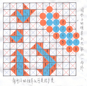 角棋是在围棋玩法原理基础上创新 出的新 型围棋。因棋子的形状发生了变化,所以玩的 过程中它能给人一种新的感觉。我们知道围棋 的棋子是布在棋盘中两线的交叉点上,而角棋 的子则是布在棋盘的小方格里。它在每个小方 格里可以有四种各不相同的角位供对弈者走棋 时选择。除此之外角棋的围子吃子与下围棋的 规则完全一样。下面我们以围棋的扭羊头为例 看角棋与围棋的同与不同。(图另附) 图中我 们看到角棋的扭羊头,可以随时改变扭动方 向,具有主动性。围棋的扭羊头只能沿着某一 方向扭动是被动性的。我们也看到围棋中的相 关战术应用在角棋中它的形态发生很大变异, 所以因棋子的形状不同,使得角棋在走棋风格 上与围棋有所不同。如围棋布子时我们可以将 子直接贴近对方的子布局,但角棋布子时就不 能这样,因为这样直接贴近对方的子会立刻使 自己这颗子陷入被人家扭羊头的被动局面。所 以角棋走子必须要其它子提供掩护的条件下再 间接的去贴近对方的棋子,这就是角棋在走棋 风格上与围棋的最大不同特点。角棋除了按围 棋规则的玩法之外,还设计出两种新的玩法。 后两种玩法因棋子可以在棋盘中走动,我们又 称它为动态玩法,这里因篇幅有限不便详细介 绍,敬请见谅。若有兴趣有能力开发者可来信 来函联系。