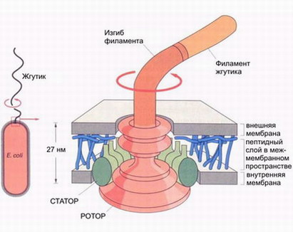Esherichia Coli细菌是纳米工艺学家的希望,它可以成为未来纳米生物机器人的制备“基础”。为了游动,它利用特殊的生物电机旋转自己的鞭毛,当鞭毛按逆时针开始同步旋转时,鞭毛会扭绞成一束,从而形成特殊的螺旋桨。螺旋桨旋转产生迫使细菌几乎沿直线运动的力,此后鞭毛的旋转方向会变成相反方向,这时鞭毛束会散开,细菌会停下来,不是向前运动而是开始作不规则转动。