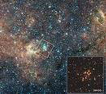 所示照片中,明亮恒星团用白色方框表示,照片右下角的小图是其放大明细图。