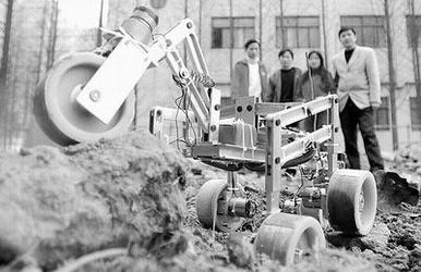 这是上海交大机器人研究所专门试制的众多登月车中的一辆。这位矮小的“蜘蛛形机器人”不仅善于爬高,而且能履沙砾坑洼如平地,还能以侧身30度以上角度,倾斜着在“模拟月球”环境中“昂首前进”!