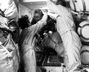 这张录像画面显示美国华裔宇航员焦立中(中)进入空间站时受到两名俄罗斯和美国宇航员的欢迎。 莫斯科时间10月16日8点15分(北京时间10月16日12点15分),俄“联盟TMA-5”号飞船与国际空间站对接舱对接成功。对接比原定时间提前2分钟完成。对接时,空间站的轨道高度近地点为258公里,远地点为374公里。这次升空的宇航员包括美籍华裔宇航员焦立中和两名俄罗斯宇航员。