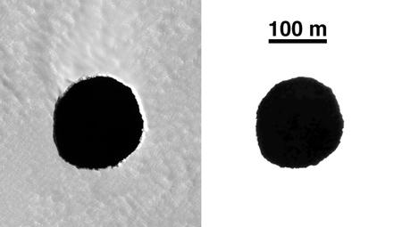 北京时间11月1日消息,据国外媒体报道,研究人员称,科学家日前在火星上发现的洞穴其实是由陨星撞击和火山在短时间内合力形成的。显然,火星洞穴的形成与地球洞穴的形成截然不同,后者是在长期、缓慢的水滴溅落过程中形成的。