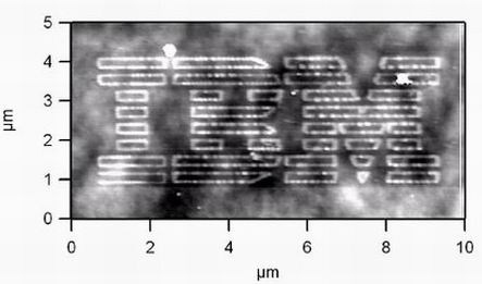 在展示分子喷涂的潜力时科学家借助唯一的尖端利用由带有5对碱基DNA片段宽度为59~79纳米线条绘出IBM标记(见图2),如此之小的标记,在一根头发的横断面上可以放上300多个。