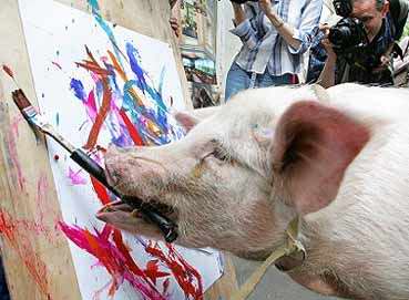 在俄罗斯首都莫斯科市中心,当地的艺术家举办了一场别开生面的动物画画表演。你看,这只可爱的小白猪口衔画笔,正聚精会神地作画呢!