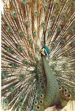 春未夏初,是饲养在动物园里的雄孔雀大显英姿的时候。你看它,把尾屏高高地举起展开,支撑在翘起的尾羽上,形如一把大扇子。铜绿色疏散的羽支,散落在每根羽轴的两侧,每根羽毛的端处,有一个眼状斑,眼状斑由暗紫、蓝绿、铜色、暗褐、浅黄和浅葡萄红色等多种颜色组成。孔雀不停地走来走去,并用力抖动着尾屏