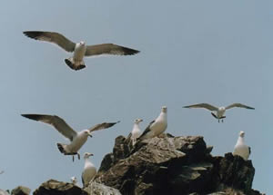 海鸥 在一望无际的大海上空,总能见到翱翔着的一群群白色的海鸥。它们伸展着双翅,边飞边叫来回盘旋,一会儿昂首远看,注视着来往轮船;一会儿又低头俯寻,搜索着水中动态。忽然,发现了食物,只见它急速扇动翅膀,一头扎进水里捕捉,而后衔着胜利品重又飞离水面,找一处海边或岛屿的僻静环境,津津有味地吃起来。