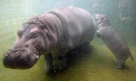 快要8周大的雄性小河马尼诺在德国柏林动物园和妈妈卡蒂在水中嬉戏。小尼诺的体重大约有60公斤,它的妈妈则重达2.5吨。