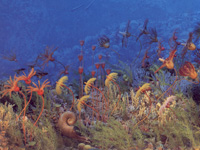 有一种生活在幽深海底的,形态如同百合花姬样美丽的动物,人们叫它“海百合”。 海百合柔软的肉体,由无数细小的骨板连接包裹起来,既灵活自如,又能保持它婷婷玉立的姿态。它们的“茎”,长约0.5米,五棱形状,分许多个节,节上长出卷技。它的头顶上有朵淡红色的“花”——那根本不是花,是只捕虫的网子。