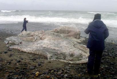 智利渔民在首都圣地亚哥南部约1000公里的洛斯穆埃莫斯海滩发现巨大罕见的海洋生物遗体,长39英尺(约11.9米),重达13吨,被认为是一只章鱼。两名科学家在测量这个生物遗体。科学家已经从它身上取出一些样本,送往法国科学部。