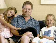 因格利斯抱着特德与两个女儿在一起 一只皮肤下被嵌入了身份微芯片的小猫,在跳出窗户失踪了10年之久后,终于重新回到以前主人的家里。这家主人名叫克里斯·因格利斯,黑色小猫名叫特德,在20世纪90年代在动物体内埋身份芯片技术刚刚兴起时,克里斯就给自己的宠物体内埋了这种芯片,但有一天特德却突然失踪,而且自此杳无音信。