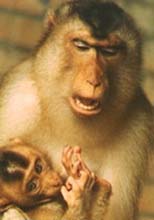 豚尾猴栖息于热带、亚热带森林中,经常成群活动。它吃各种植物性食物,如野果、种子、 嫩芽、蔬菜等,也吃动物