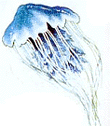 水母亦称海蜇,属腔肠动物。水母全身柔软,没有坚硬的骨骼。整个身体分上下两部,上部是圆形伞部,样子很像帽子和蘑菇,下部垂挂着许多须状物,称作腕或触手。在海水中,水母像是一团团半透明的胶状体,似成形又未成形,时起时落,随波荡漾。宋代沈与求诗称“复如缁笠绝雨缨,混沌七窍俱未形。块然背负群虾行,嗟其巧以怪自呈。”。在古藉上也有不少记载,较为详细的是李时珍的《本草纲目》一书:海蛰“大者如床,小者如斗,无眼目腹胃,以虾为目,虾动蛇沉”。大型水母伞部直径可达1米。沙蛰伞部直径达1.6米,重175公斤。面蛰略小,伞部直径约40厘米。水母伞部呈青蓝色或暗红色或暗褐色。