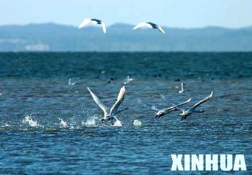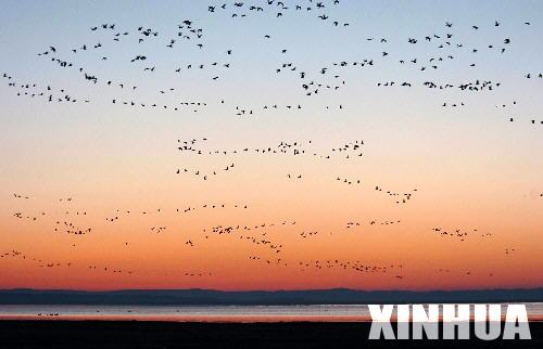 一群白天鹅在朝霞映红的内蒙古克什克腾旗达里诺尔湖面上戏水。 草原秋日,数以万计的白天鹅从遥远的西伯利亚飞抵内蒙古达里诺尔湖畔栖息。浩荡天鹅群在湖畔悠闲信步,戏水高歌,映着如镜的碧波,飘若仙子,景色蔚为壮观。 达里诺尔是集保护珍稀鸟类及其赖以生存的草原、湖泊、湿地和沙地疏林于一体的国家级自然保护区,在这里长年生活的珍稀鸟类达160种。