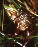 正如这个名字所告诉你的,这种铃蛙的身体是有着金色的标记的绿色。它们的后腿是亮蓝色的,身体硕大。当你去碰触它的时候,它会喷出一种有辛辣气味的液体。 它们生活在温暖气候的地方,它们也生活在新南威尔士沿岸到加拿大的安大略省的热带草丛中。 金绿色蛙是濒危物种主要是因为它们缺少生活环境,科学家们对它们的幼苗也知之甚少。