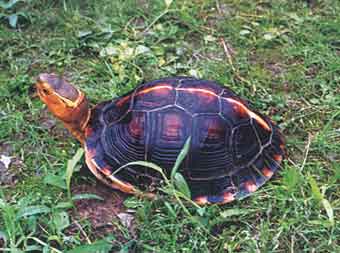 黄缘盒龟,壳长130mm左右。头中等,头背皮肤光滑。背甲高隆;壳高几为壳长的1/2,脊棱明显。背腹甲以韧带相连,盾片均具清晰的疣轮及平行于疣轮的同心纹。腹甲平,前后二叶亦以韧带相连,可动,能向上完全闭合于背甲。肛盾大,单枚,有一不达末端的中央沟。成体沟长约占盾片的1/2,幼体仅末端沟不显。四肢略扁,指、趾间微蹼。尾短。头背橄榄绿色,体背棕红色,脊棱淡*,腹甲棕黑色,唯背甲外侧缘、缘盾腹面及腹甲外缘鲜*,因而得名。