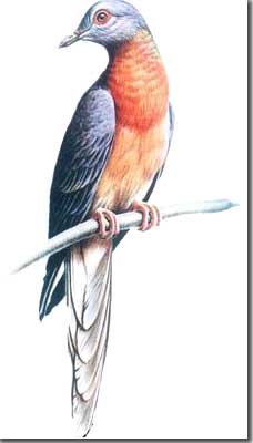 旅行鸽 旅行鸽,顾名思义,是一种特别喜欢旅行的鸽子。它们终年无忧无虑的生活在北美大陆上,每到迁徙的季节,它们成千上万遮天蔽日。当欧洲人刚踏上北美大陆时,这里有50多亿只旅鸽。可是,欧洲人来到这里之后,由于旅鸽肉味鲜美,开始遭到他们大规模的围猎。从此,旅鸽也就一步步走向了灭绝。当时,鸽肉在市场上轻易买到,密执安州一个季节里就捕获了750万只旅鸽。在不到100年的时间里,旅鸽从几十亿猛减到濒临灭绝的地步。