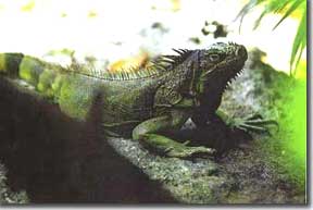 古巴地鬣鳞蜥 鬣鳞蜥是鬣鳞蜥科中体型较大的一类爬行动物,归鬣鳞蜥属。该属全球大约有13种。最常见的普通鬣鳞蜥身长可达到1.8米,分布在从墨西哥南方到巴西的广大地区,属树栖性动物。它们特别喜欢下面有水的大树。一旦有什么风吹草动,就会从树上跳入水中。鬣鳞蜥的身体呈绿色,上面有规则的褐色环,尾巴上也有,主要食大量的嫩叶和水果。不过,与它同科的蜥蜴也吃小的鸟类和哺乳动物。