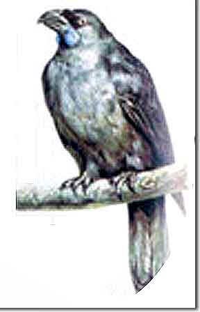 垂耳鸦 垂耳鸦因其嘴基部有一对下垂肉而得名。垂耳鸦和新西兰椋鸟一样生活在新西兰北部岛屿的茂密森林里,但叫声和新西兰椋鸟完全不同,是那种令人听了毛骨悚然的“哇、哇”叫声。垂耳鸦的身长约0.38米,其中长长的尾巴占身长的近一半。它们全身的羽毛为灰黑色,腹部比背部要稍浅一些。垂耳鸦最显著的特征是开蓝色的肉垂。