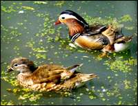 小型游禽。全长约40厘米。雄鸟羽色艳丽,并带有金属光泽。额和头顶中央羽色翠绿;枕羽金属铜赤色,与后颈的金属暗绿和暗紫色长羽形成冠羽;头顶两侧有纯白眉纹;飞羽褐色至黑褐色,翅上有一对栗黄 < 1 > < 2 >